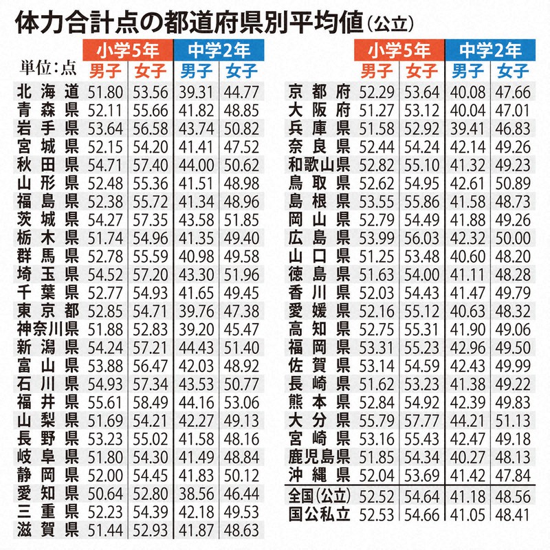 男子の体力 過去最低に 肥満も増 コロナ影響か 全国体力テスト 毎日新聞 年1回行われるスポーツテスト(体力測定)の各種目の平均 小学生男子の立ち幅跳びの平均長 学年(年齢) 平均長(cm) 1年生(6歳) 2年生(7歳) 3年生(8歳) 4年生(9歳) 5年生(10歳) 6年...